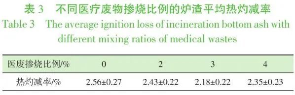 表3給出了不同醫(yī)療廢物摻燒比例的爐渣平均熱灼減率。