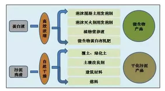 污泥經(jīng)水解處理后,其含蛋白液體經(jīng)濃縮后可作為蛋白發(fā)泡劑和有機(jī)肥等利用,污泥殘渣可用做覆土、綠化土、土壤改良劑和建筑材料等。