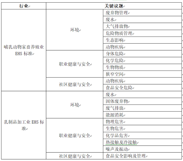 在聯(lián)合國可持續(xù)發(fā)展目標(biāo)及各個國際組織出臺的可持續(xù)議題基礎(chǔ)之上,目前國際上也形成了行業(yè)導(dǎo)向的可持續(xù)發(fā)展標(biāo)準(zhǔn)。其中,由世界銀行集團國際金融公司制定的《環(huán)境、健康與安全指南(EHS)》中就有針對乳制品行業(yè)的養(yǎng)殖端與加工端,在充分考慮行業(yè)特色的基礎(chǔ)上分別形成了兩套指標(biāo),《哺乳動物家畜養(yǎng)殖業(yè)環(huán)境、健康與安全指南》與《乳制品加工業(yè)環(huán)境、健康與安全指南》,重點關(guān)注行業(yè)在環(huán)境、職業(yè)健康與安全、社區(qū)健康與安全三大領(lǐng)域下的可持續(xù)發(fā)展。對于乳制品行業(yè)的養(yǎng)殖端來說,應(yīng)重點關(guān)注環(huán)境層面的表現(xiàn),包括養(yǎng)殖過程中的廢棄物、廢水處理、溫室氣體排放情況、潛在生態(tài)影響、動物疾病等方面;對于加工端來說,應(yīng)重點關(guān)注加工制造過程中的能耗情況、廢氣排放情況、固體廢棄物處理,以及生產(chǎn)安全情況等方面。