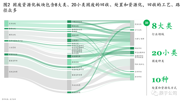 固廢資源化板塊包含8大類、20小類固廢的回收、處置和資源化,回收的工藝、路徑眾多(見圖2),除此之外還包含環(huán)衛(wèi)等服務(wù)領(lǐng)域,最大的特點(diǎn)就是規(guī)模大——當(dāng)前的總市場(chǎng)規(guī)模超過2萬億,足夠容納20個(gè)千億級(jí)環(huán)保企業(yè),而且“十四五”期間預(yù)計(jì)還將保持8%~10%的年復(fù)合增長(zhǎng)率。