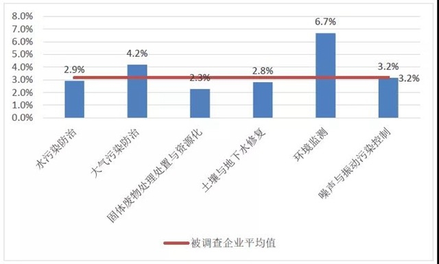 2020年環(huán)保企業(yè)平均研發(fā)支出同比增長16.8%,研發(fā)支出占營業(yè)收入的比重為3.2%,高于2020年全國規(guī)模以上工業(yè)企業(yè)研發(fā)支出占營業(yè)收入的比重(1.41%)。其中,環(huán)境監(jiān)測領(lǐng)域研發(fā)支出占營業(yè)收入的比重最高,達6.7%。研發(fā)人員數(shù)量占從業(yè)人數(shù)的比重為17.1%,同比增長0.6%。企業(yè)平均專利授權(quán)數(shù)從2019年的4.5件增長到4.8件。