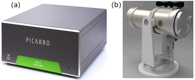 圖2.(a)原位點(diǎn)式CRDS監(jiān)測(cè)儀(b)區(qū)域開(kāi)放式TDLAS監(jiān)測(cè)儀