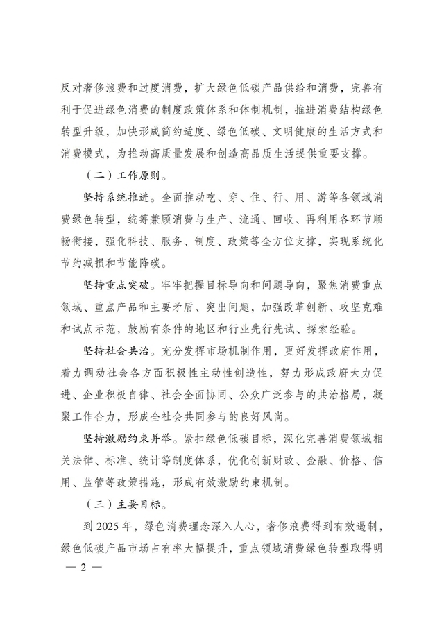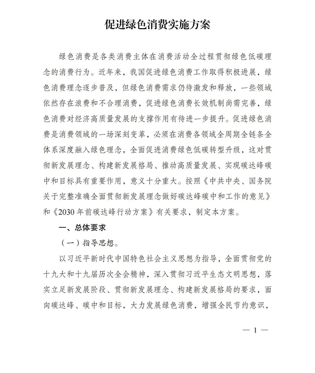 為深入貫徹落實(shí)《中共中央、國務(wù)院關(guān)于完整準(zhǔn)確全面貫徹新發(fā)展理念做好碳達(dá)峰碳中和工作的意見》和《2030年前碳達(dá)峰行動(dòng)方案》有關(guān)要求,根據(jù)碳達(dá)峰碳中和工作領(lǐng)導(dǎo)小組部署安排,國家發(fā)展改革委、工業(yè)和信息化部、住房和城鄉(xiāng)建設(shè)部、商務(wù)部、市場監(jiān)管總局、國管局、中直管理局會(huì)同有關(guān)部門研究制定了《促進(jìn)綠色消費(fèi)實(shí)施方案》?,F(xiàn)印發(fā)給你們,請結(jié)合實(shí)際,認(rèn)真抓好貫徹落實(shí)。