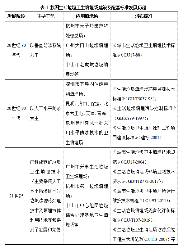我國生活垃圾衛(wèi)生填埋技術(shù)主要經(jīng)歷了三個階段:20世紀80年代以垂直防滲為主的衛(wèi)生填埋場、20世紀90年代以水平防滲為主的衛(wèi)生填埋場、21世紀垃圾衛(wèi)生填埋技術(shù)、垃圾滲濾液處理技術(shù)及填埋氣體利用技術(shù)完善的衛(wèi)生填埋場,建設(shè)及配套標(biāo)準(zhǔn)見表1[1]。