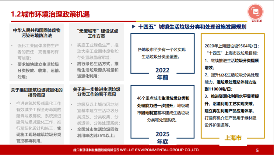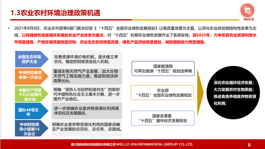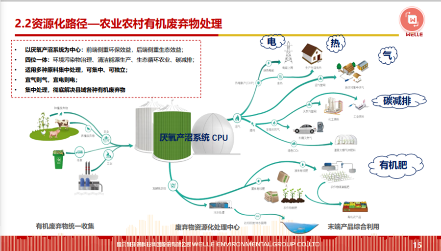 本文圍繞碳中和背景下的政策機遇、城鄉(xiāng)有機廢棄物資源化的的主要處理方法和路徑等內(nèi)容展開,同時對維爾利集團概況和發(fā)展歷程做了簡要回顧。 2021年10月20-21日,2021年中國沼氣學(xué)會學(xué)術(shù)年會暨中德沼氣合作論壇在南京舉行。作為2021年中國沼氣學(xué)會學(xué)術(shù)年會的承辦單位,維爾利環(huán)保科技集團股份有限公司董事長李月中博士以《城鄉(xiāng)有機廢棄物資源化路徑探討》為主題,與大家一起探討了碳中和背景下城鄉(xiāng)有機廢棄物資源化的發(fā)展與未來。報告圍繞碳中和背景下的政策機遇、城鄉(xiāng)有機廢棄物資源化的的主要處理方法和路徑等內(nèi)容展開,同時對維爾利集團概況和發(fā)展歷程做了簡要回顧。本文根據(jù)其發(fā)言整理。▼維爾利環(huán)??萍技瘓F股份有限公司董事長 李月中各位領(lǐng)導(dǎo)、各位專家、各位同仁,大家上午好!今天有幸代表維爾利集團和大家做交流,作為會議的承辦方,也感謝中國沼氣學(xué)會、南京大學(xué)、德國沼氣協(xié)會給維爾利這個機會。維爾利作為專業(yè)的企業(yè),實際上歷史并不是很長,但是我們對沼氣和厭氧技術(shù)這塊有自己的獨到見解。作為一個商業(yè)機構(gòu),企業(yè)怎么能夠在競爭行業(yè)里生存和發(fā)展?在這里和大家做一些交流,和大家一起思考,同時希望在座的同仁能夠在這個行業(yè)相對比較困難的情況下抱團取暖。2020年9月,國家主席習(xí)近平在聯(lián)合國大會上提出“二氧化碳排放力爭于2030年前達到峰值,努力爭取2060年前實現(xiàn)碳中和”。2021年3月15日,習(xí)近平總書記主持召開中央財經(jīng)委員會第九次會議并發(fā)表重要講話強調(diào),要把碳達峰、碳中和納入生態(tài)文明建設(shè)整體布局,拿出抓鐵有痕的勁頭,如期實現(xiàn)2030年前碳達峰、2060年前碳中和的目標(biāo)。從能源結(jié)構(gòu)上來說,有機垃圾資源化產(chǎn)生的生物質(zhì)能源在實現(xiàn)雙碳目標(biāo)上具有獨特意義。這實際上也是倒推企業(yè)行業(yè)轉(zhuǎn)型。對大家來說,“碳達峰碳中和”既是一個挑戰(zhàn)也是一個機會。這里面包括了現(xiàn)在我們推出的對城市環(huán)境,對農(nóng)村農(nóng)業(yè)環(huán)境可能存在的機會,這些機會對環(huán)保產(chǎn)業(yè)來說,個人認為受到政策影響比較大。為什么德國2016年在農(nóng)業(yè)生物天然氣領(lǐng)域有下滑?是因為某些政策出現(xiàn)了不到位的情況,一些企業(yè)就不愿意去做。在碳達峰、碳減排的前提下,我們有很多的機會,但這個機會要真正落實,還是要國家從頂層設(shè)計到具體的政策到位,才能夠使這個行業(yè)有比較好的發(fā)展。在城市環(huán)境治理領(lǐng)域,城市有機廢棄物(垃圾量)非常大。上海實施垃圾分類以后,2020年上海濕垃圾的產(chǎn)生量是每天在9500-10000噸左右,也就是說1/3為濕垃圾。這對焚燒廠來說,是一個巨大的減負,但同時對處理能力也有了條件限制。我們深度參與了這方面工作,現(xiàn)在上海的處理能力大概為4000噸左右,意味著上海的濕垃圾處理能力還有60%在建,徹底實現(xiàn)垃圾分類的路還很遠。北京情況更為嚴重。原來北京只有幾個堆肥廠,原來只是三相做一點小的堆肥,如果真的要實現(xiàn)垃圾源頭分類,大概4、5千噸的垃圾處理設(shè)施要重新建設(shè)。在農(nóng)業(yè)農(nóng)村環(huán)境治理領(lǐng)域,包括農(nóng)產(chǎn)品加工這方面,整個市場規(guī)??赡芨?。各位前輩都已經(jīng)做了一些介紹,我們是不是能夠全部實現(xiàn)資源化處理,是值得商榷的。對于不同的原料,我們應(yīng)該怎么處理?作為企業(yè),我們推行起來還是有一定的難度。我們現(xiàn)在的這些大型的沼氣項目,它的源頭、原料、收益、收益成本,包括最終的產(chǎn)品出路,收集半徑到底多少是最合理的?實際上是需要根據(jù)不同有機廢棄物的種類以及最終產(chǎn)品的出路來規(guī)劃項目規(guī)模,而不是按照政策要求。比如一萬方的沼氣工程才稱得上大型沼氣項目,才有補貼,這樣的項目就不一定能夠真正地實現(xiàn)盈利。 下面大概講一講我們最近對城鄉(xiāng)有機廢棄物資源化的主要處理方法和路徑。