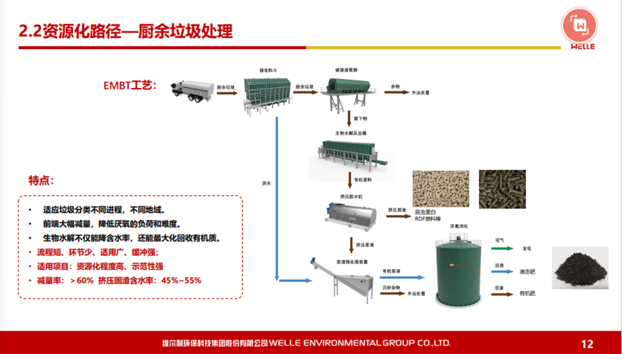對于有機廢棄物的原料及核心技術(shù),可以說從城市有機廢棄物到農(nóng)村有機廢棄物,現(xiàn)在最核心的還是通過厭氧發(fā)酵技術(shù),最終通過沼氣化利用,達到無害化或者是環(huán)保化,再盡可能實現(xiàn)資源化。國家發(fā)改委推出了一百個餐廚垃圾處理試點項目,之后進行全方位地推出。在國內(nèi)真正運行好的餐廚垃圾項目并不是特別多,主要工藝還是以厭氧為主。為什么這塊資源化的效率會好一些?尤其在“碳減排”的壓力下,使得出口價格一直比較好,這個行業(yè)最近稍微能夠掙點錢。另外,更深度的資源化利用,比如做有機質(zhì),食用的昆蟲養(yǎng)殖,也會有一些收益,再加上沼氣的收益。對于餐廚垃圾處理,我認為如果到了一定規(guī)模,收益還是不錯的。相對來說,廚余垃圾的資源化利用效率會差一些?,F(xiàn)在全國都在推行垃圾分類,不同城市廚余垃圾的質(zhì)量相差比較大。如上海的廚余垃圾含水率、油脂含量與餐廚垃圾是有一點類似的,含油量可能稍微小一點,但在其他城市就相差非常大。廚余垃圾資源化是節(jié)省能源化的利用,以無害化為主,有一些也可以做食用昆蟲的養(yǎng)殖。 對于濕垃圾或者是廚余垃圾,我們特別推出一款技術(shù)——EMBT技術(shù)。結(jié)合生物水解技術(shù),原理是有機廢棄物或者有機物在厭氧發(fā)酵過程當(dāng)中主要是通過酸化水解以及產(chǎn)甲烷兩個階段,我們通過設(shè)施化的反應(yīng)器,把酸化水解在前面就能夠作為預(yù)處理,真正地溶解到水下面的有機物再到厭氧處理,這樣使得厭氧反應(yīng)器不要那么復(fù)雜,剩下的固渣資源化也會比較方便,去做水量化的利用都是可行的。這個工藝現(xiàn)在在上海包括在紹興做下來,還是受到比較多的認可。