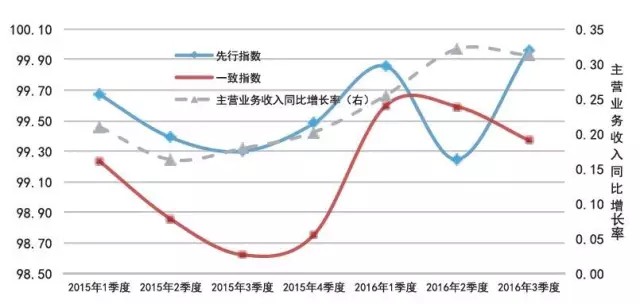 2015 年1季度-2016年3季度A股環(huán)保上市企業(yè)數(shù)據(jù)測算結果顯示:一致指數(shù)與A股環(huán)保上市企業(yè)主營業(yè)務收入增長率的變化趨勢基本吻合(如圖3所示),先行指 數(shù)的先行特征顯著,驗證了EICI指標體系的有效性。此外,對先行指數(shù)進行的周期性檢驗結果表明,主營環(huán)保上市企業(yè)的先行指數(shù)的領先周期在2015年度為 2個季度、在2016年度為1個季度(如圖4所示),該結果表現(xiàn)出環(huán)保產(chǎn)業(yè)的經(jīng)濟敏感度有所提高,即先行指數(shù)結果可用于對環(huán)保產(chǎn)業(yè)未來1個季度的走勢進行 預判。