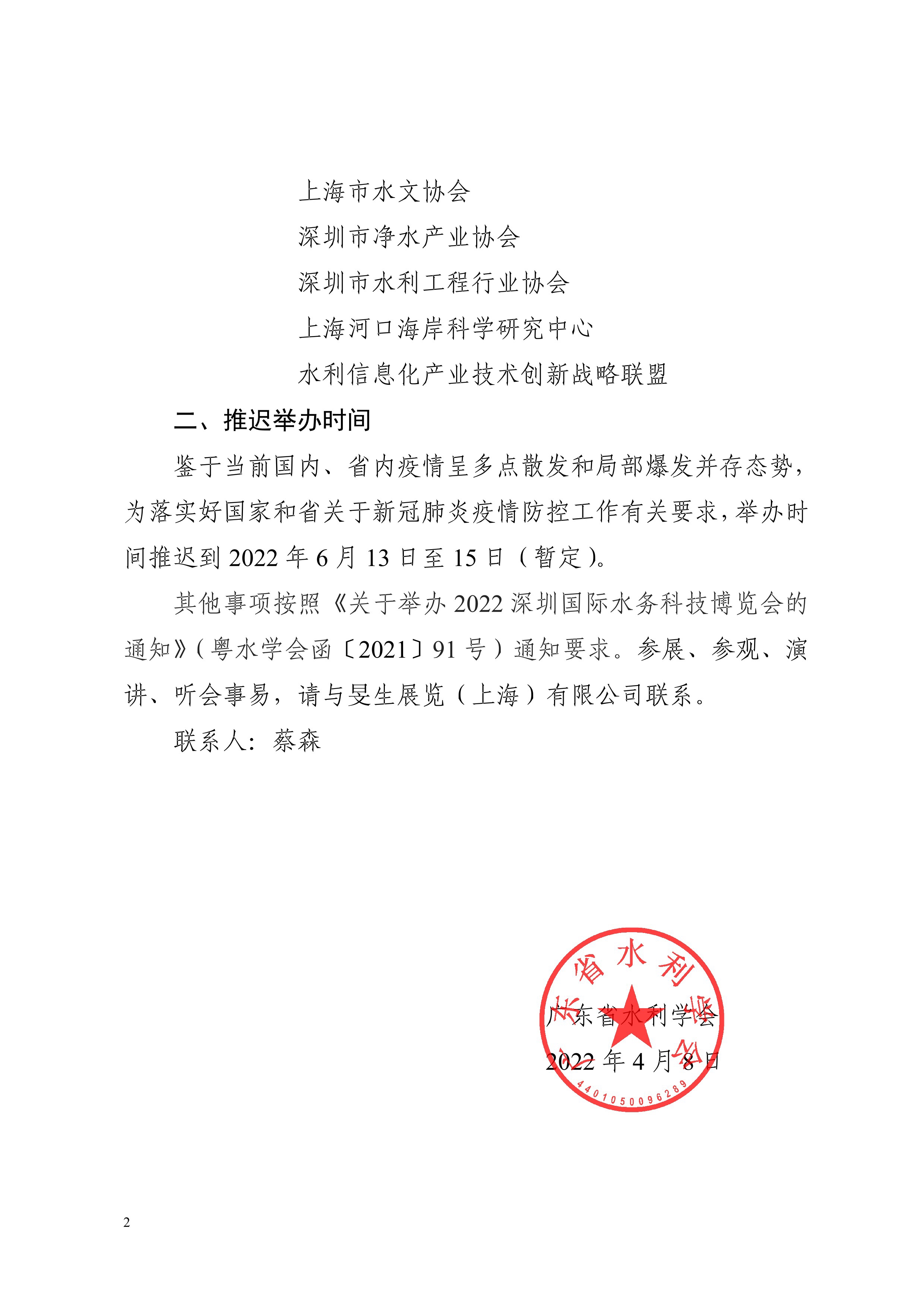 由我會與廣東省水利水電技術(shù)中心、深圳市水務(wù)學(xué)會共同主辦、旻生展覽(上海)有限公司承辦的“2022深圳國際水務(wù)科技博覽會”,原定于2022年4月20日至22日舉行。為進(jìn)一步做好組織發(fā)動和新冠肺炎疫情防控工作,有關(guān)事項(xiàng)補(bǔ)充通知如下: