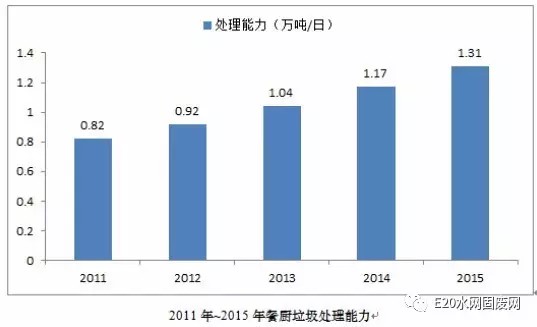“十二五”期間,我國(guó)的餐廚垃圾處理行業(yè)還處于建設(shè)初期,國(guó)家缺少配套政策和相關(guān)標(biāo)準(zhǔn),試點(diǎn)城市建設(shè)處于摸索階段。到“十二五”末期,餐廚垃圾處理量達(dá)到295.65萬(wàn)噸/年,處理能力為1.31萬(wàn)噸/天,與“十二五”規(guī)劃提出的3萬(wàn)噸/天的處理能力仍有很大差距,餐廚廢棄物的處理仍存在一定的缺口。2015年末,我國(guó)餐廚垃圾處理率仍然很低,約為7%。未處理的餐廚垃圾大量流入小作坊,成為了提煉地溝油的原料,嚴(yán)重威脅到我國(guó)的食品安全和人體健康。
