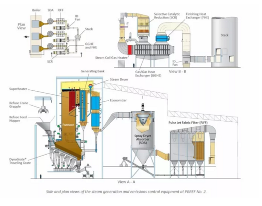 接下來說重點,介紹一下這個焚燒廠。全廠為3x1000t/d的偉倫爐排,煙氣工藝采用了SDA+布袋+GGH+SGH+SCR。該廠位于特朗普老家,而且離得不遠,是目前美國最先進的焚燒廠,也是第一座采用SCR工藝的焚燒廠,2012年開始建設(shè)至2015年投入商業(yè)運行,隸屬于佛羅里達州海岸縣固廢管理局。