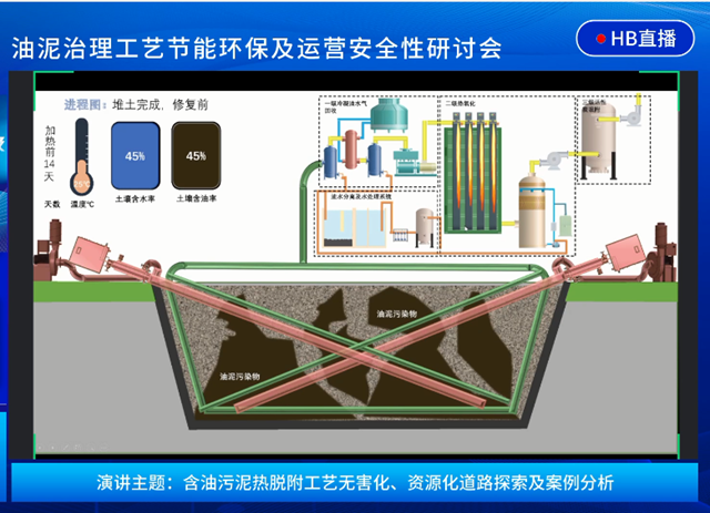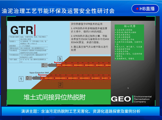 本次研討會上陳曉松博士也帶來了《含油污泥熱脫附工藝無害化、資源化道路探索及案例分析》的分享。陳博士重點介紹了GEO公司的堆土間接熱脫附技術(shù),堆土間接熱脫附技術(shù)也是原位脫附技術(shù)的翻版,核心技術(shù)原理上是一致的。堆土間接熱脫附技術(shù)首先會將污染土堆成一個土堆,在外圍圍上隔熱板,然后插入加熱井和抽提井,加熱井連接燃燒器及空氣,抽提井連接地表尾氣處理設(shè)備。