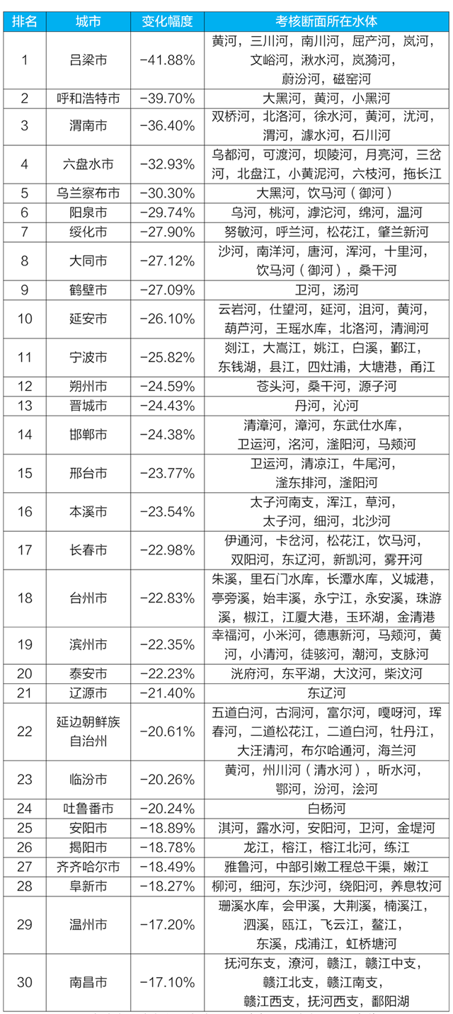 水環(huán)境質(zhì)量狀況排名前30位城市及所在水體