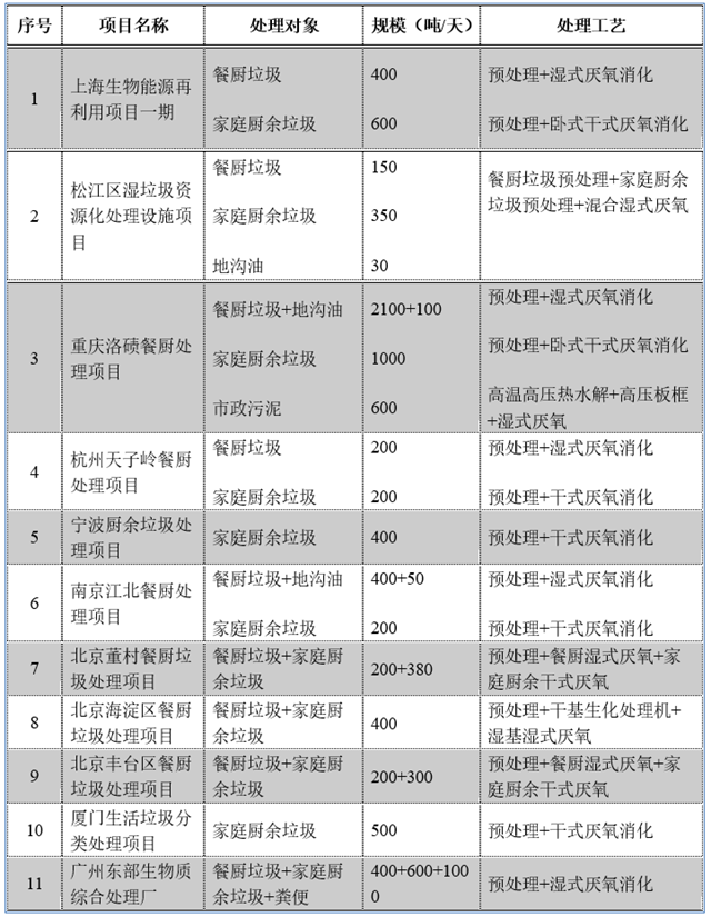 表2 國內(nèi)部分已建廚余垃圾處理設(shè)施和處理工藝統(tǒng)計表