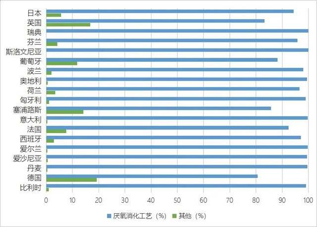 由圖1可以看出,目前發(fā)達(dá)國家的廚余垃圾處理技術(shù)主要以厭氧消化為主,約占市場份額的9成左右。其主要原因是相比于堆肥等其他處理技術(shù),厭氧消化技術(shù)更加環(huán)保和先進(jìn),受到業(yè)內(nèi)的廣泛關(guān)注,逐步形成一套成熟的產(chǎn)業(yè)鏈,進(jìn)而得到市場的認(rèn)可和推廣。