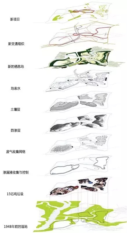 環(huán)境修復(fù)與垃圾防滲是弗萊士河公園改造初期的關(guān)鍵任務(wù),其中運用了多層覆蓋技術(shù),收集廢棄物產(chǎn)生的氣體、滲漏液的系統(tǒng)和水質(zhì)檢測系統(tǒng)(圖7,圖8)。場地生態(tài)修復(fù)需達到嚴(yán)格的標(biāo)準(zhǔn)后方允許啟動各類建設(shè)項目。
