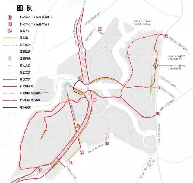 (5)在生態(tài)敏感度允許條件下優(yōu)化交通網(wǎng)絡(luò),提升公園在紐約市域及區(qū)域范圍內(nèi)的可達性;