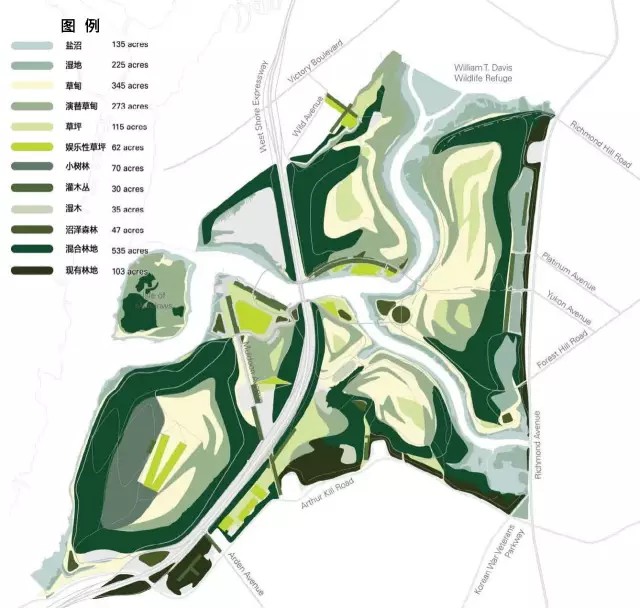 在1948年垃圾填埋場運營之前,弗萊士河區(qū)域是哈德遜河河口最大的濕地之一,50多年的垃圾填埋對生態(tài)造成了嚴(yán)重的影響。公園總體規(guī)劃旨在恢復(fù)基地原有的生態(tài)風(fēng)貌與動植物棲息地,并設(shè)立了五個主要目標(biāo):