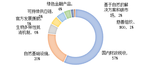 根據(jù)保爾森基金會(huì)的統(tǒng)計(jì)數(shù)據(jù),2019年全球用于生物多樣性保護(hù)的資金約為1240-1430億美元,遠(yuǎn)低于為實(shí)現(xiàn)到2030年保障生物多樣性水平所需的7220-9670億美元的資金需求,每年的資金缺口約為598-824億美元。在2019年統(tǒng)計(jì)的生物多樣性資金中,57%來自國內(nèi)財(cái)政稅收,20%來自自然基礎(chǔ)設(shè)施投入,6%來源于生物多樣性抵消機(jī)制。官方發(fā)展援助和可持續(xù)供應(yīng)鏈提供的資金比例都為5%,而綠色金融產(chǎn)品提供資金僅占比4%。