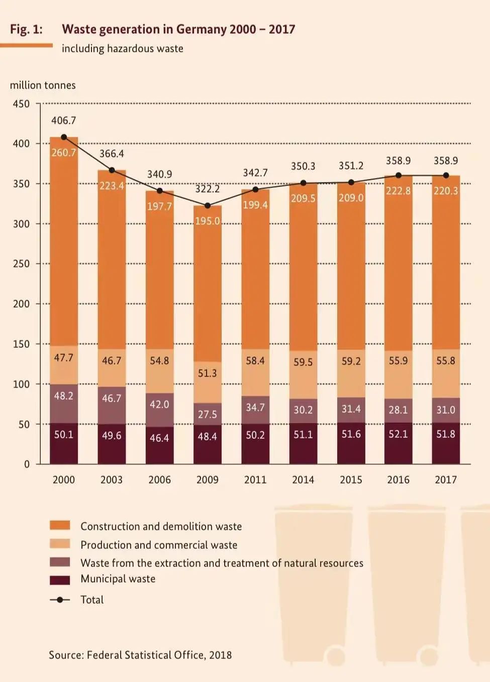2017年垃圾產(chǎn)生量為35890 萬噸,其中建筑垃圾22030萬噸,生產(chǎn)及商業(yè)垃圾5580萬噸,開采和處理自然資源產(chǎn)生的廢棄物3100萬噸;城市垃圾5180萬噸。