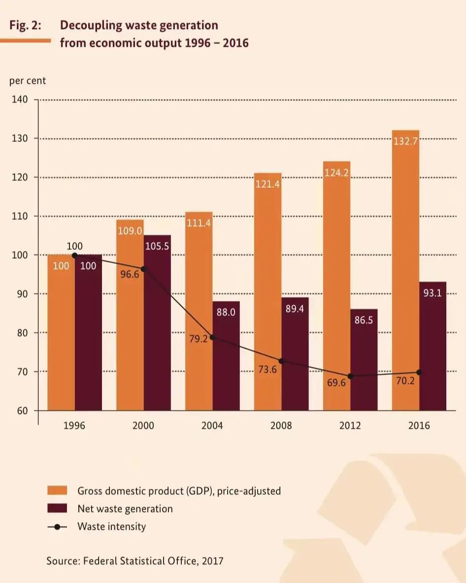 歐盟修訂的廢棄物法要求成員國在2025年達(dá)到55%的廢棄物回收率,2030年達(dá)到60%,2035年達(dá)到65%。同時,回收率的計算方法從基于投入改為面向產(chǎn)出。因此,德國廢棄物管理支持從源頭上對廢棄物進(jìn)行分類。