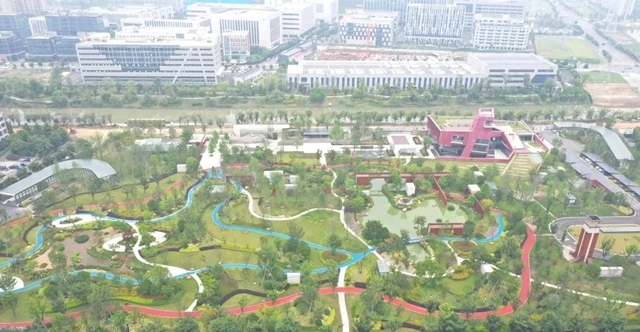 成都市雙流公興(中電子)再生水廠項目設(shè)計規(guī)模10萬噸/日,采用地下式設(shè)計,大大節(jié)約占地面積,地上是開放式生態(tài)綠地公園及科普教育中心,有效滿足城市界面與基礎(chǔ)設(shè)施環(huán)境高度融合,還社會以廣闊的自然空間。同時,項目以新理念、高標(biāo)準(zhǔn)打造,在環(huán)境融合度、建設(shè)標(biāo)準(zhǔn)和功能延伸方面突破傳統(tǒng),賦予了城市基礎(chǔ)設(shè)施更大價值。