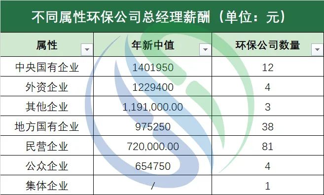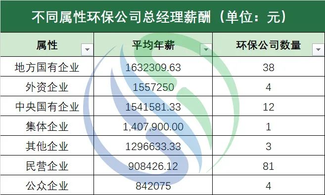 “固廢>水務(wù)”這一趨勢和過去兩年的環(huán)保上市公司業(yè)績趨勢一致。中國水網(wǎng)2020年與2021年的環(huán)保上市公司年報(bào)數(shù)據(jù)統(tǒng)計(jì)結(jié)果顯示,連續(xù)兩年,固廢處置行業(yè)的營業(yè)收入與凈利潤雙雙超過水務(wù)行業(yè)。近兩年隨著《“十四五”城鎮(zhèn)生活垃圾分類和處理設(shè)施發(fā)展規(guī)劃》、《“十四五”循環(huán)經(jīng)濟(jì)發(fā)展規(guī)劃》、《“十四五”時(shí)期“無廢城市”建設(shè)工作方案》等政策的出臺,帶動了固廢處置行業(yè)中環(huán)衛(wèi)、餐廚垃圾處理等細(xì)分領(lǐng)域的發(fā)展,從而在一定程度上影響了固廢處置行業(yè)環(huán)保上市公司總經(jīng)理們的年薪水平。不過水務(wù)行業(yè)的環(huán)保企業(yè)也不用太焦慮。進(jìn)入“十四五”時(shí)期以來,《關(guān)于推進(jìn)污水資源化利用的指導(dǎo)意見》、《“十四五”城鎮(zhèn)污水處理及資源化利用發(fā)展規(guī)劃》等一系列關(guān)于污水固廢資源化的政策頻繁出臺。在新建水務(wù)項(xiàng)目越來越少的情況下,國家也多次出臺措施助推存量資產(chǎn)盤活,為水務(wù)企業(yè)發(fā)展提供新的思路。此外,從事大氣治理、環(huán)保裝備制造、土壤修復(fù)與環(huán)境監(jiān)測等細(xì)分領(lǐng)域的企業(yè)隨著近年來國家政策的出臺,乘著政策紅利的東風(fēng),其市場規(guī)模也日益突顯,相繼迎來發(fā)展高峰。如,《2021-2030年大氣污染治理行業(yè)發(fā)展展望報(bào)告》數(shù)據(jù)顯示,預(yù)計(jì)2021-2025年大氣污染治理市場規(guī)模約為1.6-1.8萬億元;在環(huán)保裝備制造領(lǐng)域,工信部、科技部、生態(tài)環(huán)境部三部門于今年1月21日聯(lián)合印發(fā)的《環(huán)保裝備制造業(yè)高質(zhì)量發(fā)展行動計(jì)劃》提出,到2025年,環(huán)保裝備制造業(yè)產(chǎn)值要力爭達(dá)到1.3萬億元;再如第三方環(huán)境監(jiān)測運(yùn)營市場也逐步釋放,2021年上半年共注冊5.0萬家環(huán)境監(jiān)測類企業(yè),同比增長72.4%……種種政策和市場需求創(chuàng)造的紅利為這些細(xì)分領(lǐng)域帶來了積極因素。無論管理層還是普通員工,都是企業(yè)發(fā)展的一個(gè)“齒輪”,個(gè)人收入的多少都與企業(yè)經(jīng)營狀況掛鉤。環(huán)境產(chǎn)業(yè)各細(xì)分領(lǐng)域市場潛力的釋放與從業(yè)者薪資水平正如月球牽引著潮汐,潮漲潮落,有跡可循。筆者按照wind的分類,將143家環(huán)保公司分為中央國有企業(yè),地方國有企業(yè)、集體企業(yè)、民營企業(yè)、公眾企業(yè)、外資企業(yè)和其他企業(yè)七大類。根據(jù)統(tǒng)計(jì)數(shù)據(jù)顯示,地方國有企業(yè)以163.23萬元的總經(jīng)理平均年薪位列第一,外資企業(yè)和中央國有企業(yè)分別位列第二、三位,其總經(jīng)理平均年薪分別為155.73萬元和154.16萬元。前三整體年薪水平差距不大。
