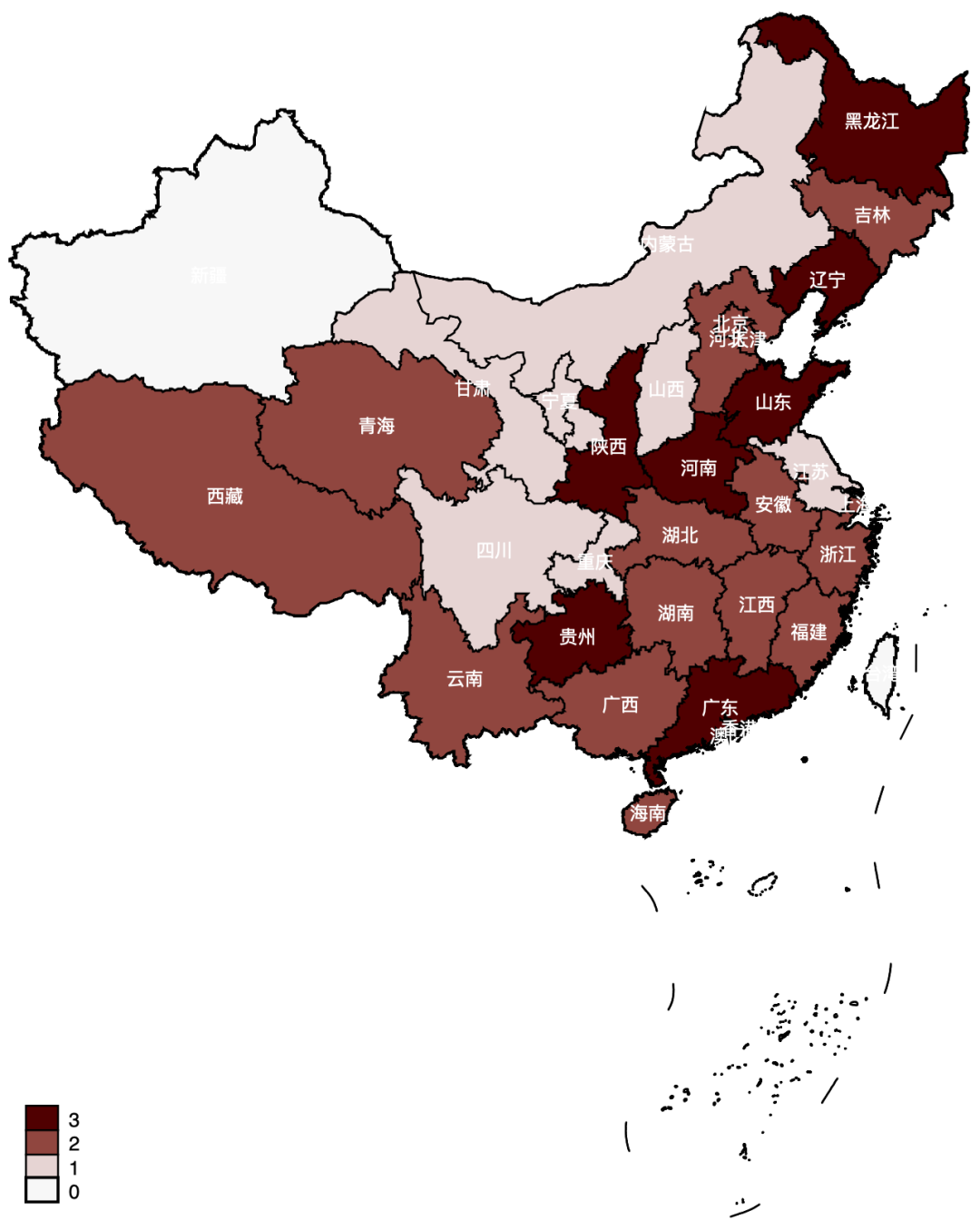 地區(qū)上看,中央環(huán)保督察組進駐的31個省區(qū)市中,除新疆維吾爾自治區(qū)(含新疆生產(chǎn)建設兵團)外,其余30個省區(qū)市均被反饋過生活垃圾問題。其中,河南省、山東省、遼寧省、廣東省、山西省、貴州省和黑龍江省最為突出,在3次中央環(huán)保督察中均被反饋了生活垃圾問題,詳見圖2。