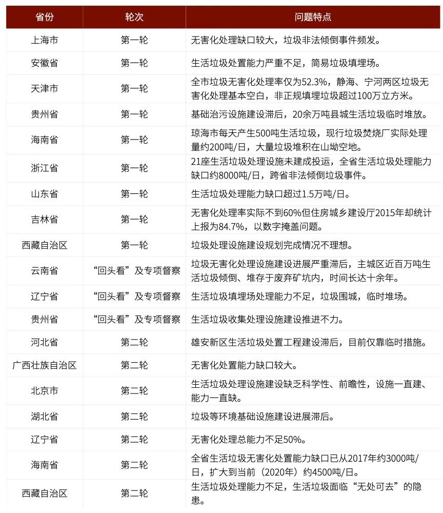 個別省區(qū)市歷史上無害化處理率低、無害化處理能力不足問題嚴重。其中,山東省在第一輪例行督察中被中央環(huán)保督察組反饋“生活垃圾處理能力缺口超過1.5萬噸/日”、云南省在“回頭看”及專項督察中被反饋“垃圾無害化處理設施建設進展嚴重滯后,主城區(qū)近百萬噸生活垃圾傾倒、堆存于廢棄礦坑內,時間長達十余年”、北京市第二輪例行督察被反饋“生活垃圾處理設施建設缺乏科學性、前瞻性,設施一直建、能力一直缺”等。具體情況詳見表1。