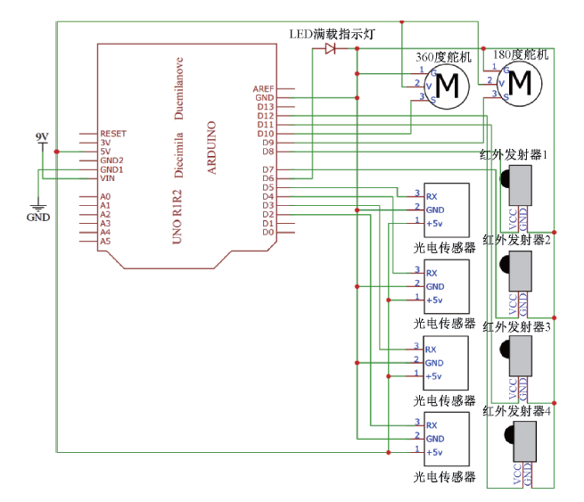 下位機(jī)硬件電路設(shè)計(jì)如圖4所示,Arduino 工作電壓一般為3~5 V,符合Led指示燈和4個(gè)紅外發(fā)射器的電壓要求,故可直接將該5個(gè)器件連接在引腳與CND之間,實(shí)現(xiàn)開(kāi)關(guān)控制。LED正極連接Arduino 6號(hào)引腳,紅外發(fā)射器1、2、3、4的正極分別連接Arduino的 11、12、8、7號(hào)引腳。同理,2個(gè)舵機(jī)通過(guò)Arduino的+5V和 GND形成回路進(jìn)行供電。2個(gè)舵機(jī)均通過(guò)PWM信號(hào)控制,對(duì)應(yīng)Arduino 10號(hào)引腳和9號(hào)引腳,通過(guò)不同的占空比轉(zhuǎn)動(dòng)對(duì)應(yīng)的角度,實(shí)現(xiàn)了云臺(tái)及翻斗的精準(zhǔn)控制。4個(gè)光電傳感器供電原理同上,RX引腳分別連接Arduino 的5、4、3、2引腳,同時(shí)將Arduino 上的這4個(gè)引腳定義為輸入模式,實(shí)時(shí)檢測(cè)垃圾桶的裝載狀態(tài)。