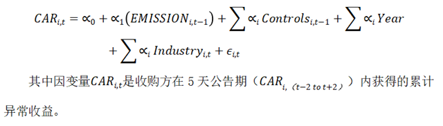 具體地,作者主要提出以下幾個問題:(1)碳風險對并購決策是否重要,尤其是跨境目標的選擇?(2a)收購方的碳風險是否與收購公告的市場反應(yīng)有關(guān)?(2b)排放對收購公告回報的影響是否因公司的 CSR 聲譽而減弱或增強?