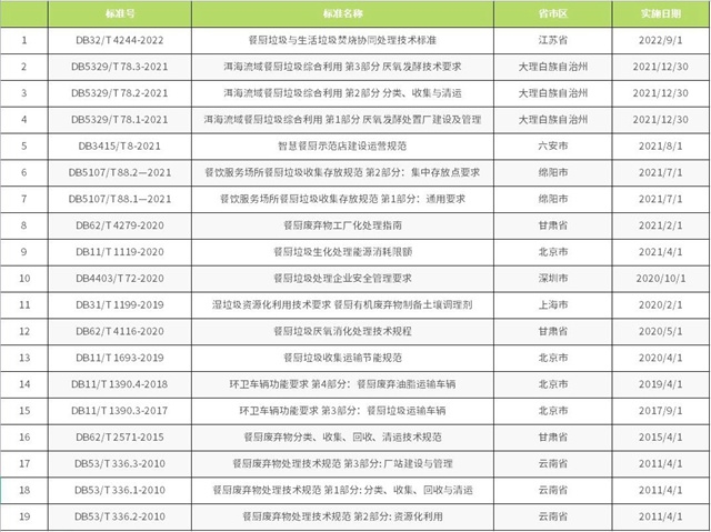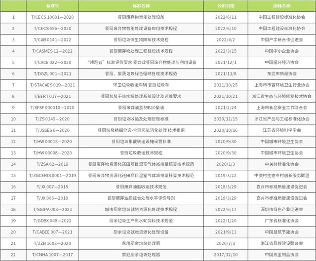 截至目前,已備案的餐廚垃圾相關(guān)標(biāo)準(zhǔn)有《餐廚垃圾車》QC/T 935-2013、《餐廚棄物處理機(jī)》JB/T 12342-2015、《餐廚廢棄物油水自動(dòng)分離設(shè)備》CJ/T 478-2015、《餐廚垃圾自動(dòng)分選系統(tǒng) 技術(shù)條件》JB/T 13166-2017、《餐廚廢棄物生產(chǎn)肥料中生物腐植酸含量測定方法》HG/T 5603-2019和《土壤調(diào)理劑及使用規(guī)程 餐廚廢物原料》NY/T 3935-2021。