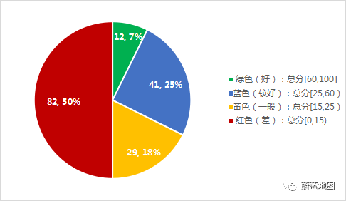 共有12個(gè)城區(qū)垃圾分類指數(shù)等級(jí)為好,占7%,比2021年年末增長1%,41個(gè)為較好,占25%,增長13%,為差的82個(gè),占50%,減少15%。圖 6 參評(píng)城市主城區(qū)得分等級(jí)占比