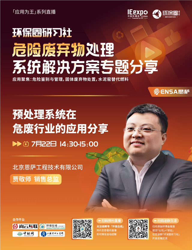 7月22日(星期五)下午14:00-15:30,環(huán)保圈研習(xí)社“應(yīng)用為王”系列直播,危險(xiǎn)廢棄物處理系統(tǒng)解決方案專題分享,我們有幸邀請(qǐng)到了上?;ぴ?、北京恩薩、潤(rùn)天環(huán)保3家企業(yè)的技術(shù)專家做客直播間,與我們共同探討危險(xiǎn)廢棄物的鑒別與管理,危廢焚燒預(yù)處理,水泥窯協(xié)同處置等技術(shù)及相關(guān)解決方案。