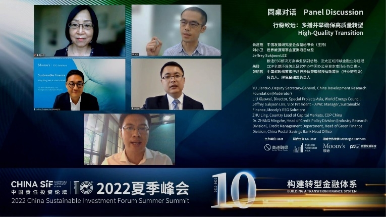 第二輪圓桌對話環(huán)節(jié)圍繞“多措并舉確保高質(zhì)量轉(zhuǎn)型”展開,由中國發(fā)展研究基金會副秘書長俞建拖主持。世界能源理事會亞洲項目總監(jiān)劉小衛(wèi),穆迪ESG解決方案事業(yè)部副總裁、亞太區(qū)可持續(xù)金融業(yè)務(wù)經(jīng)理Jeffrey Sukjoon LEE,CDP全球環(huán)境信息研究中心中國辦公室資本市場業(yè)務(wù)負責人朱聆,中國郵政儲蓄銀行總行授信管理部授信政策處(行業(yè)研究處)負責人與綠色金融處負責人張明哲博士就高質(zhì)量轉(zhuǎn)型背景下,可持續(xù)金融存在的短板及其原因、以及潛在的解決方案展開了熱烈討論。Jeffrey指出,轉(zhuǎn)型金融對推動亞太地區(qū)的可持續(xù)發(fā)展至關(guān)重要。如果所在行業(yè)減排難度大的發(fā)行人希望進入可持續(xù)金融市場獲得可持續(xù)融資,他們就需要可信的轉(zhuǎn)型計劃、戰(zhàn)略和指標。雖然我們看到企業(yè)在溫室氣體排放的信息披露方面取得了進步,但在標準化和覆蓋范圍方面仍有很多工作要做。