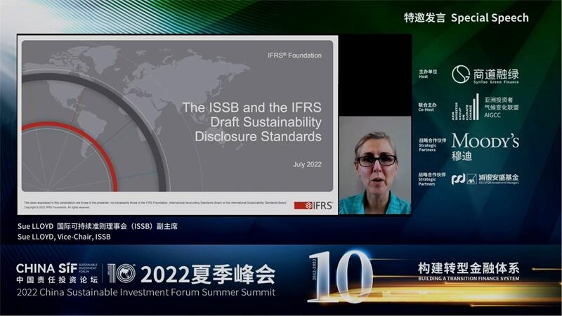 隨后,國際可持續(xù)準則理事會(ISSB)副主席Sue LLOYD做了特邀發(fā)言。她介紹,ISSB由國際財務(wù)報告準則(IFRS)基金會在2021年第26屆聯(lián)合國氣候變化大會上發(fā)起,旨在制定統(tǒng)一的可持續(xù)發(fā)展報告準則。她分享了ISSB近期發(fā)布的兩份可持續(xù)披露準則文件征求意見稿的主要內(nèi)容,即《國際財務(wù)報告可持續(xù)披露準則第1號——可持續(xù)相關(guān)財務(wù)信息披露一般要求(征求意見稿)》和《國際財務(wù)報告可持續(xù)披露準則第2號——氣候相關(guān)披露(征求意見稿)》,并呼吁大家在七月底之前積極提供反饋。