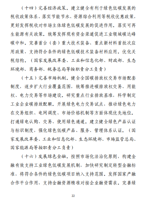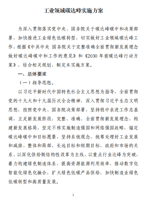 工業(yè)和信息化部 國家發(fā)展改革委 生態(tài)環(huán)境部關(guān)于印發(fā)工業(yè)領(lǐng)域碳達峰實施方案的通知工信部聯(lián)節(jié)〔2022〕88號外交部、科技部、司法部、財政部、住房城鄉(xiāng)建設(shè)部、交通運輸部、商務部、人民銀行、國資委、稅務總局、市場監(jiān)管總局、統(tǒng)計局、銀保監(jiān)會、證監(jiān)會、能源局、林草局、郵政局,各省、自治區(qū)、直轄市及計劃單列市、新疆生產(chǎn)建設(shè)兵團工業(yè)和信息化主管部門、發(fā)展改革委、生態(tài)環(huán)境廳(局):《工業(yè)領(lǐng)域碳達峰實施方案》已經(jīng)碳達峰碳中和工作領(lǐng)導小組審議通過,現(xiàn)印發(fā)給你們,請認真貫徹落實。
