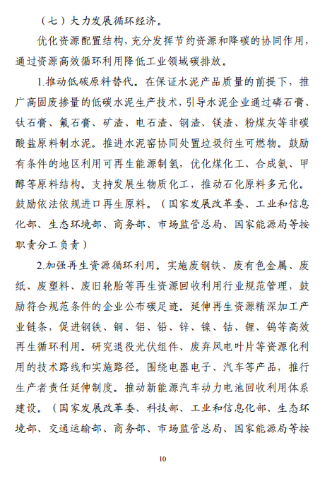 “十五五”期間,產(chǎn)業(yè)結(jié)構(gòu)布局進一步優(yōu)化,工業(yè)能耗強度、二氧化碳排放強度持續(xù)下降,努力達峰削峰,在實現(xiàn)工業(yè)領(lǐng)域碳達峰的基礎(chǔ)上強化碳中和能力,基本建立以高效、綠色、循環(huán)、低碳為重要特征的現(xiàn)代工業(yè)體系。確保工業(yè)領(lǐng)域二氧化碳排放在2030年前達峰。方案指出,加強再生資源循環(huán)利用。實施廢鋼鐵、廢有色金屬、廢紙、廢塑料、廢舊輪胎等再生資源回收利用行業(yè)規(guī)范管理,鼓勵符合規(guī)范條件的企業(yè)公布碳足跡。延伸再生資源精深加工產(chǎn)業(yè)鏈條,促進鋼鐵、銅、鋁、鉛、鋅、鎳、鈷、鋰、鎢等高效再生循環(huán)利用。研究退役光伏組件、廢棄風電葉片等資源化利用的技術(shù)路線和實施路徑。圍繞電器電子、汽車等產(chǎn)品,推行生產(chǎn)者責任延伸制度。推動新能源汽車動力電池回收利用體系建設(shè)。