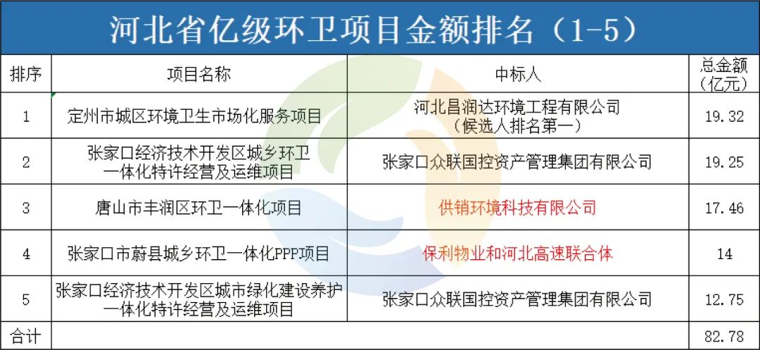 8月8日,超19億元的定州市城區(qū)環(huán)境衛(wèi)生市場(chǎng)化服務(wù)項(xiàng)目公布中標(biāo)候選人公示,河北昌潤(rùn)達(dá)環(huán)境工程有限公司排名第一;8月9日,約5.5億元三河市城鄉(xiāng)環(huán)衛(wèi)一體化項(xiàng)目又被北京環(huán)境有限公司和北京首創(chuàng)環(huán)境投資有限公司攜手?jǐn)孬@。至此,河北省今年已開標(biāo)的億級(jí)環(huán)衛(wèi)項(xiàng)目總金額已超119億元,加上在招標(biāo)項(xiàng)目,河北省今年環(huán)衛(wèi)項(xiàng)目的釋放量已超130億元!不僅如此,進(jìn)入2022年之后,河北省在生活垃圾末端處置方面的發(fā)展也較為迅速,主要體現(xiàn)在生活垃圾焚燒項(xiàng)目、建筑垃圾資源化利用項(xiàng)目等方面。而這一切的“大爆發(fā)”,和地方“十四五”時(shí)期各項(xiàng)規(guī)劃及相關(guān)政策有密切聯(lián)系??梢源竽懙仡A(yù)測(cè),未來(lái)5年,河北將是環(huán)衛(wèi)企業(yè)競(jìng)相爭(zhēng)奪的“圣地”。項(xiàng)目釋放量突破130億,國(guó)資控股企業(yè)大放異彩