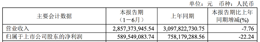公司上半年營業(yè)收入為2,857,373,945.54元,同比下降7.76%;歸屬于上市公司股東的凈利潤為589,549,083.74元,同比下降22.24%。