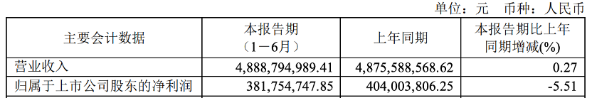 公司上半年營業(yè)收入為48.89億元,同比增長0.27%;歸屬于上市公司股東的凈利潤3.82億元,同比下降5.51%。