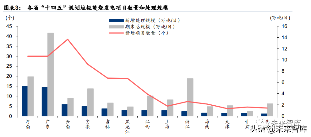 “十四五”規(guī)劃提出,到 2025 年底,全國(guó)城鎮(zhèn)生活垃圾焚燒處理能力達(dá)到 80 萬(wàn)噸/日左右, 相對(duì)“十三五”末期增量空間為 22 萬(wàn)噸/日;城市生活垃圾焚燒處理能力占比 65%左右,相對(duì) “十三五”末期提升空間仍有 20 個(gè)百分點(diǎn)。此外 13 個(gè)省(區(qū)、市)相繼發(fā)布涉及生活垃圾焚 燒發(fā)電的“十四五”規(guī)劃,結(jié)合國(guó)家統(tǒng)計(jì)局公布的 2020 年生活垃圾焚燒發(fā)電產(chǎn)能數(shù)據(jù),我 們測(cè)算得到“十四五”期間 13 個(gè)省(區(qū)、市)規(guī)劃新增垃圾焚燒項(xiàng)目 204 個(gè),新增產(chǎn)能 21.2 萬(wàn)噸/日,其中,規(guī)劃新增處理規(guī)模前二的省(區(qū)、市)為河南和廣東,分別為 5.3/5.1 萬(wàn)噸/日,對(duì)應(yīng)規(guī)劃新增項(xiàng)目數(shù)量均為 30 個(gè)。