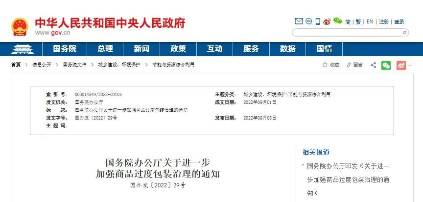 國務(wù)院辦公廳關(guān)于進(jìn)一步加強(qiáng)商品過度包裝治理的通知各省、自治區(qū)、直轄市人民政府,國務(wù)院各部委、各直屬機(jī)構(gòu):商品過度包裝是指超出了商品保護(hù)、展示、儲(chǔ)存、運(yùn)輸?shù)日9δ芤蟮陌b,主要表現(xiàn)為包裝層數(shù)過多、包裝空隙過大、包裝成本過高、選材用料不當(dāng)?shù)?。近年來,各地區(qū)、各部門按照《國務(wù)院辦公廳關(guān)于治理商品過度包裝工作的通知》(國辦發(fā)〔2009〕5號)部署,認(rèn)真推進(jìn)商品過度包裝治理,完善相關(guān)法律法規(guī)標(biāo)準(zhǔn),取得積極進(jìn)展。但治理工作仍存在不少薄弱環(huán)節(jié)和突出問題,尤其是隨著消費(fèi)新業(yè)態(tài)快速發(fā)展,商品過度包裝現(xiàn)象有“卷土重來”之勢。為貫徹落實(shí)黨中央、國務(wù)院決策部署,進(jìn)一步加強(qiáng)商品過度包裝治理,經(jīng)國務(wù)院同意,現(xiàn)就有關(guān)事項(xiàng)通知如下。各地區(qū)、各部門要以習(xí)近平新時(shí)代中國特色社會(huì)主義思想為指導(dǎo),深入貫徹習(xí)近平生態(tài)文明思想,立足新發(fā)展階段,完整、準(zhǔn)確、全面貫徹新發(fā)展理念,構(gòu)建新發(fā)展格局,推動(dòng)高質(zhì)量發(fā)展,認(rèn)真貫徹落實(shí)固體廢物污染環(huán)境防治法、消費(fèi)者權(quán)益保護(hù)法、標(biāo)準(zhǔn)化法、價(jià)格法等法律法規(guī)和國家有關(guān)標(biāo)準(zhǔn),充分認(rèn)識進(jìn)一步加強(qiáng)商品過度包裝治理的重要性和緊迫性,在生產(chǎn)、銷售、交付、回收等各環(huán)節(jié)明確工作要求,強(qiáng)化監(jiān)管執(zhí)法,健全標(biāo)準(zhǔn)體系,完善保障措施,堅(jiān)決遏制商品過度包裝現(xiàn)象,為促進(jìn)生產(chǎn)生活方式綠色轉(zhuǎn)型、加強(qiáng)生態(tài)文明建設(shè)提供有力支撐。到2025年,基本形成商品過度包裝全鏈條治理體系,相關(guān)法律法規(guī)更加健全,標(biāo)準(zhǔn)體系更加完善,行業(yè)管理水平明顯提升,線上線下一體化執(zhí)法監(jiān)督機(jī)制有效運(yùn)行,商品過度包裝治理能力顯著增強(qiáng)。月餅、粽子、茶葉等重點(diǎn)商品過度包裝違法行為得到有效遏制,人民群眾獲得感和滿意度顯著提升。(一)加強(qiáng)包裝領(lǐng)域技術(shù)創(chuàng)新。推動(dòng)包裝企業(yè)提供設(shè)計(jì)合理、用材節(jié)約、回收便利、經(jīng)濟(jì)適用的包裝整體解決方案,自主研發(fā)低克重、高強(qiáng)度、功能化包裝材料及其生產(chǎn)設(shè)備,創(chuàng)新研發(fā)商品和快遞一體化包裝產(chǎn)品。充分發(fā)揮包裝企業(yè)在推廣簡約包裝、倡導(dǎo)理性消費(fèi)中的橋梁紐帶作用,推動(dòng)包裝設(shè)計(jì)、商品生產(chǎn)等上下游各環(huán)節(jié)踐行簡約適度理念。(工業(yè)和信息化部和各地方人民政府按職責(zé)分工負(fù)責(zé))(二)防范商品生產(chǎn)環(huán)節(jié)過度包裝。督促指導(dǎo)商品生產(chǎn)者嚴(yán)格按照限制商品過度包裝強(qiáng)制性標(biāo)準(zhǔn)生產(chǎn)商品,細(xì)化限制商品過度包裝的管理要求,建立完整的商品包裝信息檔案,記錄商品包裝的設(shè)計(jì)、制造、使用等信息。引導(dǎo)商品生產(chǎn)者使用簡約包裝,優(yōu)化商品包裝設(shè)計(jì),減少商品包裝層數(shù)、材料、成本,減少包裝體積、重量,減少油墨印刷,采用單一材料或便于分離的材料。(工業(yè)和信息化部、市場監(jiān)管總局等部門和各地方人民政府按職責(zé)分工負(fù)責(zé))督促商品生產(chǎn)者嚴(yán)格遵守標(biāo)準(zhǔn)化法要求,公開其執(zhí)行的包裝有關(guān)強(qiáng)制性標(biāo)準(zhǔn)、推薦性標(biāo)準(zhǔn)、團(tuán)體標(biāo)準(zhǔn)或企業(yè)標(biāo)準(zhǔn)的編號和名稱。(市場監(jiān)管總局和各地方人民政府按職責(zé)分工負(fù)責(zé))引導(dǎo)醫(yī)療機(jī)構(gòu)針對門診、住院、慢性病等不同場景和類型提出藥品包裝規(guī)格需求。引導(dǎo)藥品生產(chǎn)者優(yōu)化藥品包裝規(guī)格。(國家衛(wèi)生健康委、國家藥監(jiān)局和各地方人民政府按職責(zé)分工負(fù)責(zé))(三)避免銷售過度包裝商品。督促指導(dǎo)商品銷售者細(xì)化采購、銷售環(huán)節(jié)限制商品過度包裝有關(guān)要求,明確不銷售違反限制商品過度包裝強(qiáng)制性標(biāo)準(zhǔn)的商品。加強(qiáng)對電商企業(yè)的督促指導(dǎo),實(shí)現(xiàn)線上線下要求一致。鼓勵(lì)商品銷售者向供應(yīng)方提出有關(guān)商品綠色包裝和簡約包裝要求。(商務(wù)部、市場監(jiān)管總局和各地方人民政府按職責(zé)分工負(fù)責(zé))督促指導(dǎo)外賣平臺企業(yè)完善平臺規(guī)則,對平臺內(nèi)經(jīng)營者提出外賣包裝減量化要求。(商務(wù)部負(fù)責(zé))督促指導(dǎo)餐飲經(jīng)營者對外賣包裝依法明碼標(biāo)價(jià)。(市場監(jiān)管總局和各地方人民政府按職責(zé)分工負(fù)責(zé))(四)推進(jìn)商品交付環(huán)節(jié)包裝減量化。指導(dǎo)寄遞企業(yè)制修訂包裝操作規(guī)范,細(xì)化限制快遞過度包裝要求,并通過規(guī)范作業(yè)減少前端收寄環(huán)節(jié)的過度包裝。鼓勵(lì)寄遞企業(yè)使用低克重、高強(qiáng)度的紙箱、免膠紙箱,通過優(yōu)化包裝結(jié)構(g