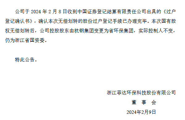菲達(dá)環(huán)保發(fā)布公告稱,2024年2月8日收到中國(guó)證券登記結(jié)算有限責(zé)任公司出具的《過戶登記確認(rèn)書》,確認(rèn)本次無(wú)償劃轉(zhuǎn)的股份過戶登記手續(xù)已辦理完畢。