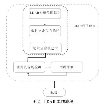 美國《石化企業(yè)泄漏檢測與修復(fù)工作指南》將LDAR工作流程劃分為LDAR項目建立、現(xiàn)場檢測和泄漏維修3個步驟,對其進(jìn)行進(jìn)一步拆解,可將LDAR工作流程劃分為LDAR實施范圍識別、密封點定位和描述、密封點臺賬建立、密封點現(xiàn)場檢測、泄漏點維修、出具報告6個步驟,如圖2所示。