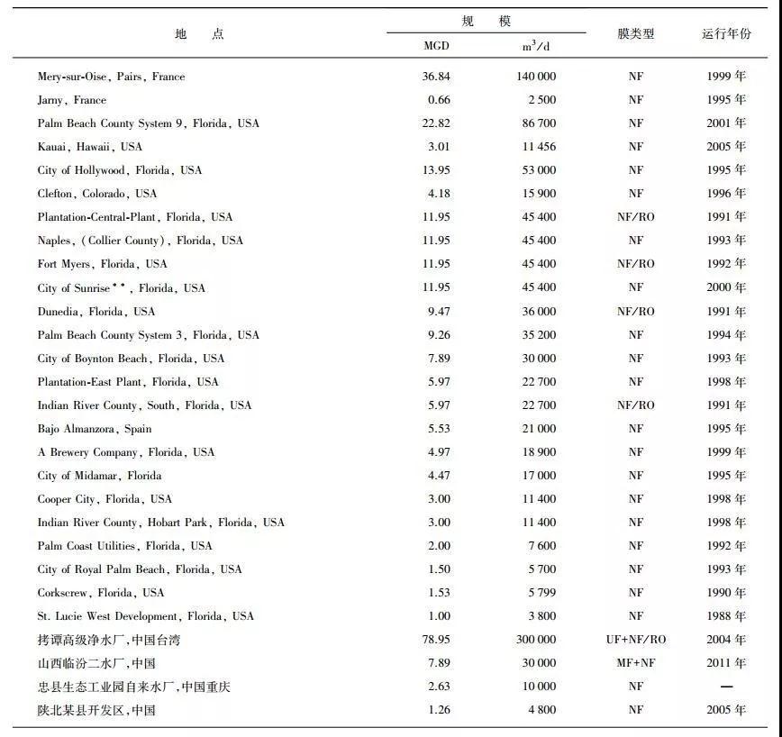 在沙特阿拉伯,沙特國家海水淡化公司(SWCC)公司成功地開發(fā)出了納濾作為海水淡化的預(yù)處理技術(shù),用于脫除硬度和總?cè)芙夤腆w,降低了反滲透的操作壓力并提高了系統(tǒng)的回收率。我國首套工業(yè)化大規(guī)模膜軟化系統(tǒng)144 m3/d納濾膜淡化苦咸水制備飲用水示范工程,由國家海洋局杭州水處理中心設(shè)計,于1997年10月在山東長島南隍城建成投產(chǎn)。