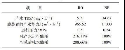 由表1可知,與常規(guī)RO膜相比,NF膜主要的技術(shù)特點(diǎn)是低壓力、低能耗,常規(guī)NF的運(yùn)行壓力在5 bar左右,節(jié)能效果顯著。NF膜對偏硅酸的截留率低,可以保留大部分偏硅酸,從飲用水的角度考慮可以保留有益的礦物質(zhì),膜系統(tǒng)的角度考慮,由于沒有硅結(jié)垢問題,所以系統(tǒng)回收率不受偏硅酸含量的影響;NF膜對碳酸氫根的截留率不高,從飲用水的角度考慮可以保留部分堿度,從膜系統(tǒng)的角度考慮,碳酸鈣結(jié)構(gòu)傾向小,系統(tǒng)回收率受LSI影響較小。NF由于結(jié)垢問題不易出現(xiàn),無需或只需要少量的阻垢劑,膜污染壓力較輕,化學(xué)清洗的頻率較低,因此藥劑用量少,運(yùn)行費(fèi)用低且化學(xué)污染排放少,因此NF可以設(shè)置較高的系統(tǒng)回收率,一方面提高了水利用率,另一方面減小濃水排放的壓力。此外,NF膜出水pH變化小,出水可直接輸入市政管網(wǎng)(腐蝕問題),堿度、TDS適當(dāng)、去除了絕大部分硫酸鹽,適當(dāng)降低了TDS,因此出水口感好。