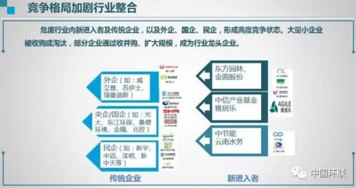 危廢市場格局是危廢行業(yè)內(nèi)新進(jìn)入者及傳統(tǒng)企業(yè),及外企、國企、民企,形成高度競爭狀態(tài)。在環(huán)保調(diào)控力度加強(qiáng)的情況下,很多資本躍躍欲試,進(jìn)入危廢處置行業(yè),包括一些大型集團(tuán),房地產(chǎn)企業(yè),綠化企業(yè),或者投資機(jī)構(gòu)等。企業(yè)跑馬圈地和異地收購將會持續(xù)下去,搶占危廢市場或?qū)⒂萦?,大量小企業(yè)被收購或淘汰,部分企業(yè)通過收并購、擴(kuò)大規(guī)模,成為行業(yè)龍頭企業(yè)。