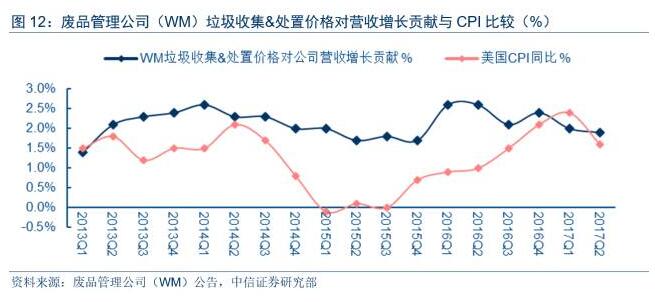 類似廢品管理(WM)這類的大型市政廢物管理公司在提升前端的收集&轉(zhuǎn)運收費標(biāo)準(zhǔn)的同時,也同時相應(yīng)提高填埋業(yè)務(wù)對外收費標(biāo)準(zhǔn),進而影響前端中小型環(huán)衛(wèi)公司的成本結(jié)構(gòu),推動中小型環(huán)衛(wèi)公司跟進提升收集&轉(zhuǎn)運價格。因此,在和上游客戶的博弈過程中,高度集中和前后端打通的市場結(jié)構(gòu)使得競爭對手不能通過不提價戰(zhàn)略而搶占龍頭企業(yè)的環(huán)衛(wèi)市場份額,并最終形成全行業(yè)廢物收集及處置價格的持續(xù)性上漲。由此可見,在市場高度集中及龍頭打通產(chǎn)業(yè)鏈的市場結(jié)構(gòu)下,小幅高于CPI的溫和性價格上漲模式具有非常高的持續(xù)性,最終推動行業(yè)規(guī)模持續(xù)穩(wěn)健上升。