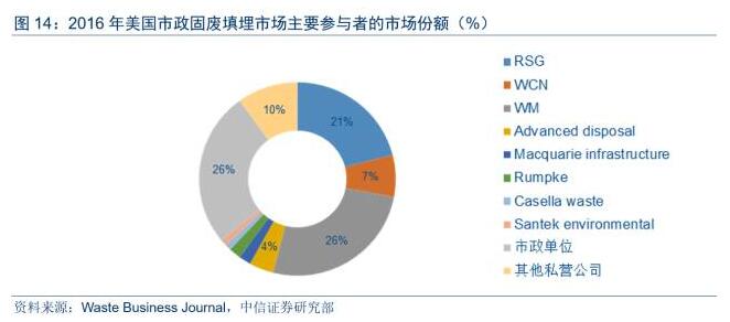 廢品管理(WM)等美國三大環(huán)衛(wèi)龍頭公司除在前端收集及轉(zhuǎn)運已經(jīng)牢牢樹立壟斷地位外,多年來通過在后端處置環(huán)節(jié)的持續(xù)大力參與,目前在填埋環(huán)節(jié)的領(lǐng)先優(yōu)勢也異常明顯。2016年,三大環(huán)衛(wèi)公司在填埋市場份額占比合計高達54%,WM、RSG及WCN在市政廢物總填埋量中占比分別為26%、21%、7%,填埋市場的寡頭壟斷特征突出。