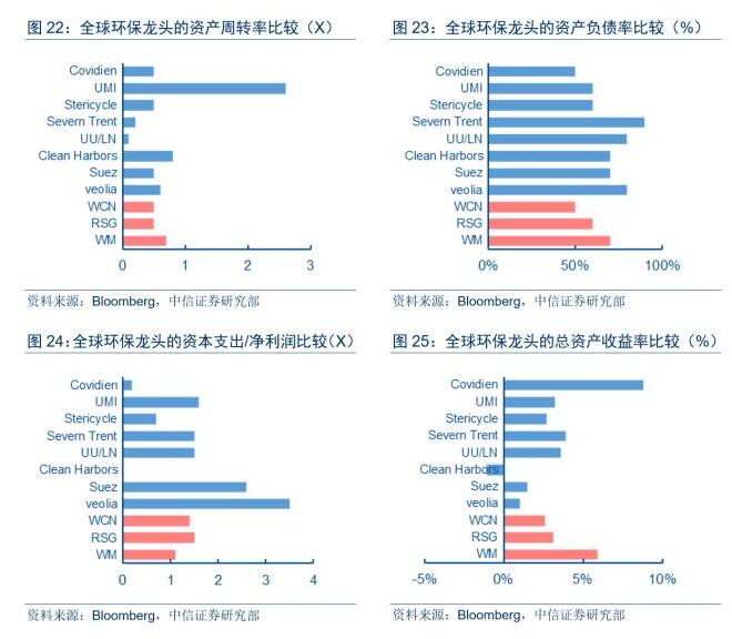 為厘清環(huán)衛(wèi)公司的商業(yè)模式為輕資產(chǎn)還是重資產(chǎn),我們選取了總資產(chǎn)收益率(ROA)、資產(chǎn)周轉(zhuǎn)率、資產(chǎn)負(fù)債率、資本支出/凈利率等4個財務(wù)指標(biāo),將廢品管理(WM)等3家美國環(huán)衛(wèi)公司的財務(wù)比率與國際上的水務(wù)、固廢、危廢領(lǐng)域代表公司進行對比,可以看出美國環(huán)衛(wèi)公司的資產(chǎn)周轉(zhuǎn)率和資產(chǎn)負(fù)債率處于行業(yè)平均水平,資本支出/凈利潤略低于行業(yè)平均,由此可見美國環(huán)衛(wèi)公司的重資產(chǎn)特征突出。以資產(chǎn)周轉(zhuǎn)率為例,2016年,廢品管理(WM)、共和服務(wù)(RSG)、廢物聯(lián)合公司(WCN)三家公司的資產(chǎn)周轉(zhuǎn)率分別為0.7x、0.5x、0.5x,和蘇伊士、威立雅的0.5x、0.6x基本接近。